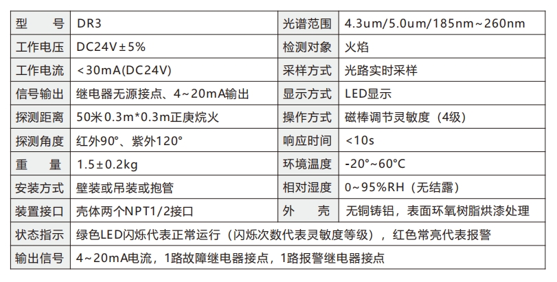 DR3火焰探測(cè)器是一款新型智能火災(zāi)探測(cè)設(shè)備。探測(cè)器采用高性能雙紅外傳感技術(shù)和紫外探測(cè)技術(shù),使用擁有窄帶濾波的不同波長的紅外傳感器設(shè)備和太陽光盲波段的紫外火焰?zhèn)鞲性O(shè)備,三個(gè)傳感器其中一紅一紫用于反應(yīng)不同波段火焰信息的中心波長,另外一個(gè)紅外傳感器用于監(jiān)視環(huán)境中的其他紅外輻射,結(jié)合火焰的閃爍特征,通過高速微處理器和技術(shù)算法進(jìn)行運(yùn)算分析,讓具有火焰特征的輻射頻譜被確認(rèn)為火警,紫外火焰?zhèn)鞲性O(shè)備能夠?qū)θ展飧蓴_有很好的抑制,從而實(shí)現(xiàn)了對(duì)火焰信號(hào)的快速響應(yīng)和準(zhǔn)確識(shí)別。此外,這款探測(cè)器既可以用作雙紅外檢測(cè),也可以用作單紫外檢測(cè),并且可以同時(shí)進(jìn)行紅外、紫外雙重檢測(cè)。