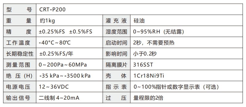 CRT-P200 壓力變送器具有面積小、重量輕、精度高、價格低等優(yōu)點,可帶現(xiàn)場指示電表,零點遷移,量程擴(kuò)展等功能,可本安和防爆,具備有工業(yè)用壓力變送器所有功能。