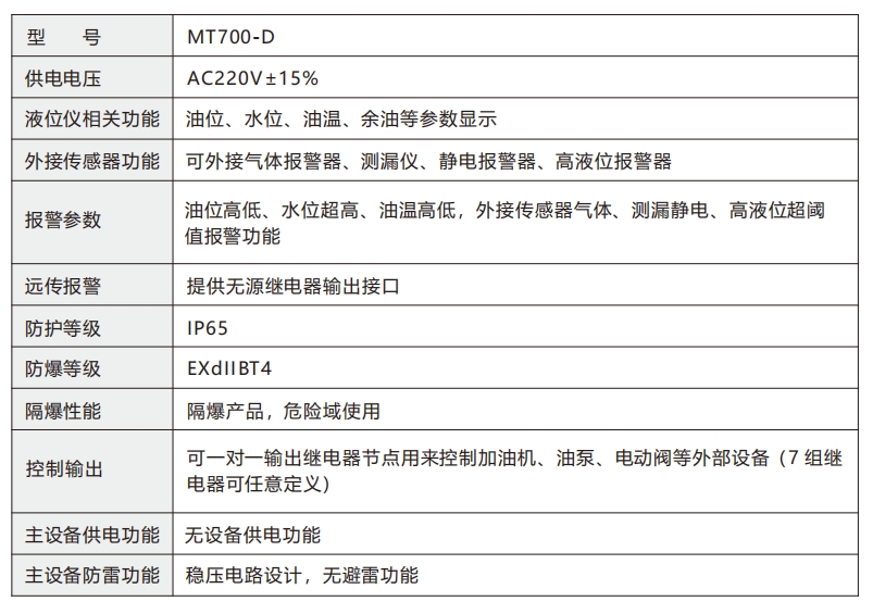 MT700-D監(jiān)控系統,是為撬裝加油站集成式監(jiān)控的需要所研制的一款產品,具備隔爆性能,可直接應用于危險區(qū)域。除實現液位儀常用功能外,可額外接可燃氣體傳感器、靜電接地報警器、測漏傳感報警器,將撬裝加油站內常見的傳感器控制主機集成于一體。