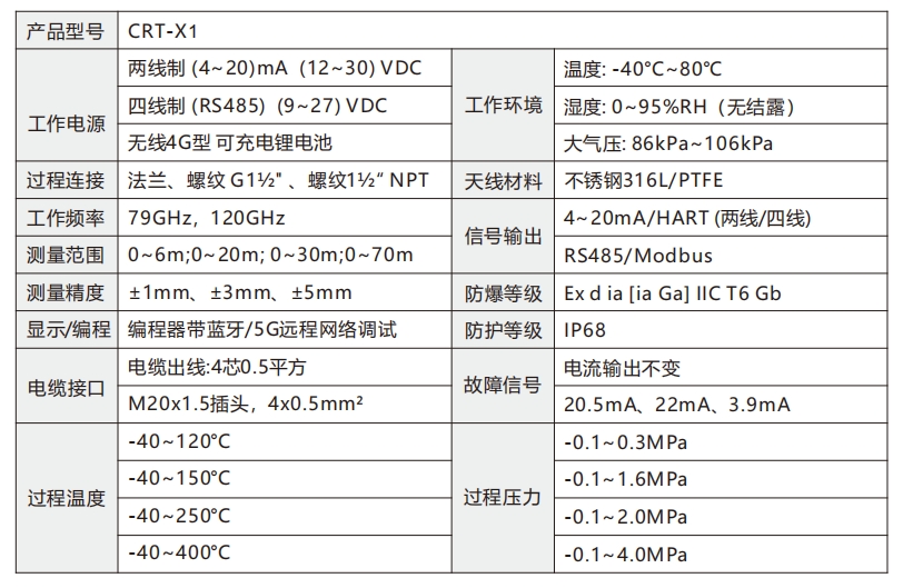 CRT-X1雷達物位計是工作在76~81GHz的調(diào)頻連續(xù)波雷達產(chǎn)品,是一種用于測量各種液體和松散顆粒物料的水平和垂直液位的高精度儀器。通過發(fā)射和接收無線電波來測量與物料表面的距離,從而確定液位高度。