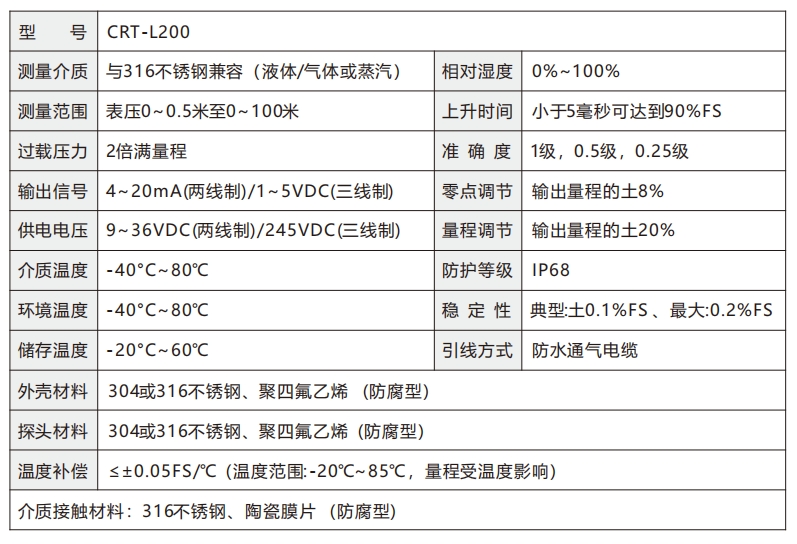CRT-L200 液位變送器是引進美國NOVA公司的擴散硅壓力傳感器和lcsensorsl電路技術(shù)開發(fā)而成的,它應(yīng)用了耐腐蝕工藝和硅晶片疊合兩項技術(shù),是一種高品質(zhì)的液位測量儀表。