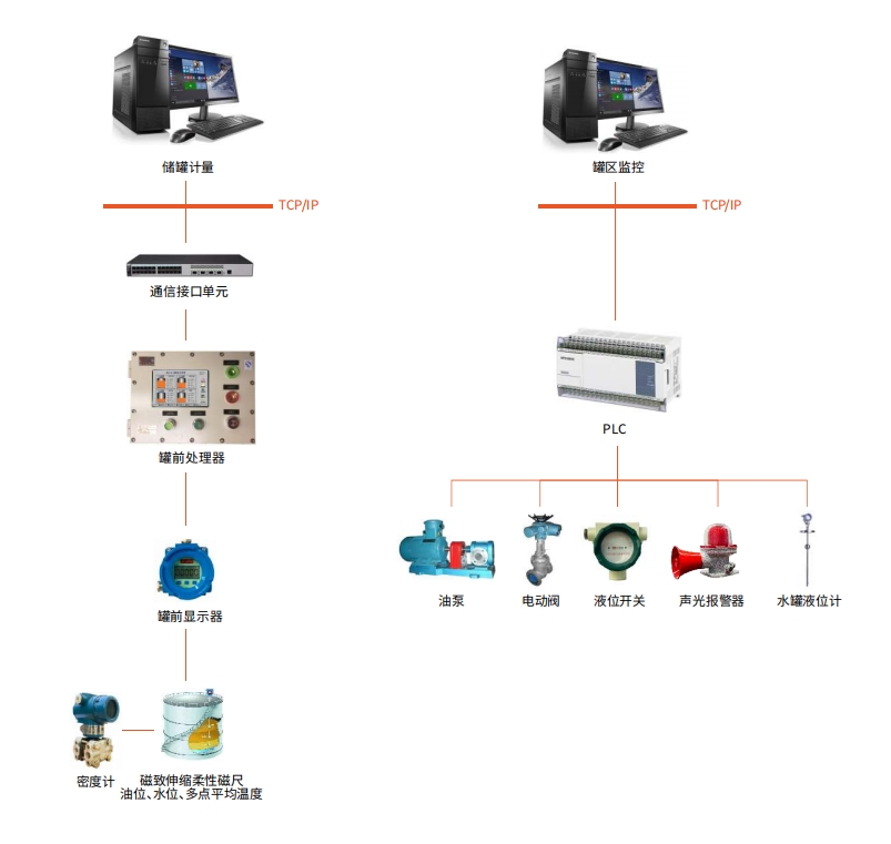 油庫過程控制系統(tǒng)由壓?變送器、液位開關、電動閥、液位計等現(xiàn)場設備以及PLC控制系統(tǒng)以及監(jiān)控上位機組成。系統(tǒng)能夠?qū)崿F(xiàn)油庫運?過程?動連續(xù)的監(jiān)視與控制,保障庫區(qū)?員、設備等安全。