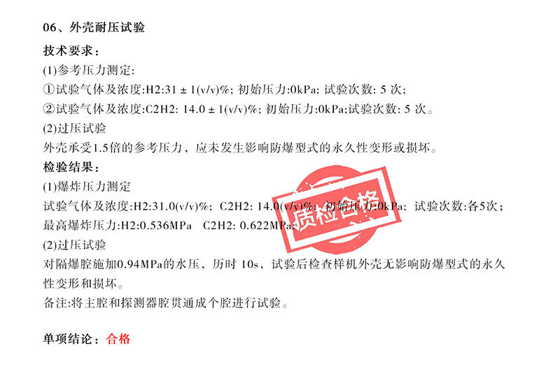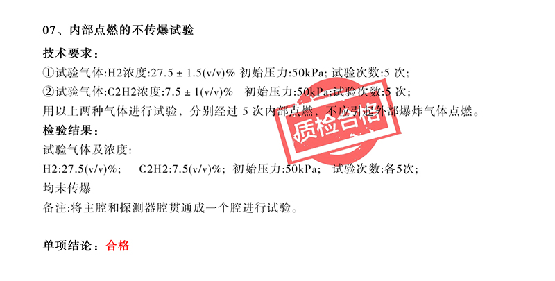 產(chǎn)品經(jīng)過(guò)多輪測(cè)試和評(píng)估,所檢產(chǎn)品均符合GB/T3836.1-2021、GB/T3836.2-2021標(biāo)準(zhǔn),判定為合格。同時(shí)檢測(cè)表明,我司探測(cè)器不僅在防爆性能方面表現(xiàn)出色,在其他各項(xiàng)性能指標(biāo)上也均達(dá)到了或超過(guò)了相關(guān)標(biāo)準(zhǔn)和要求。