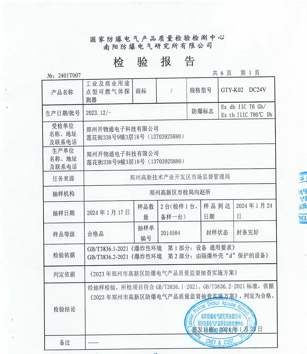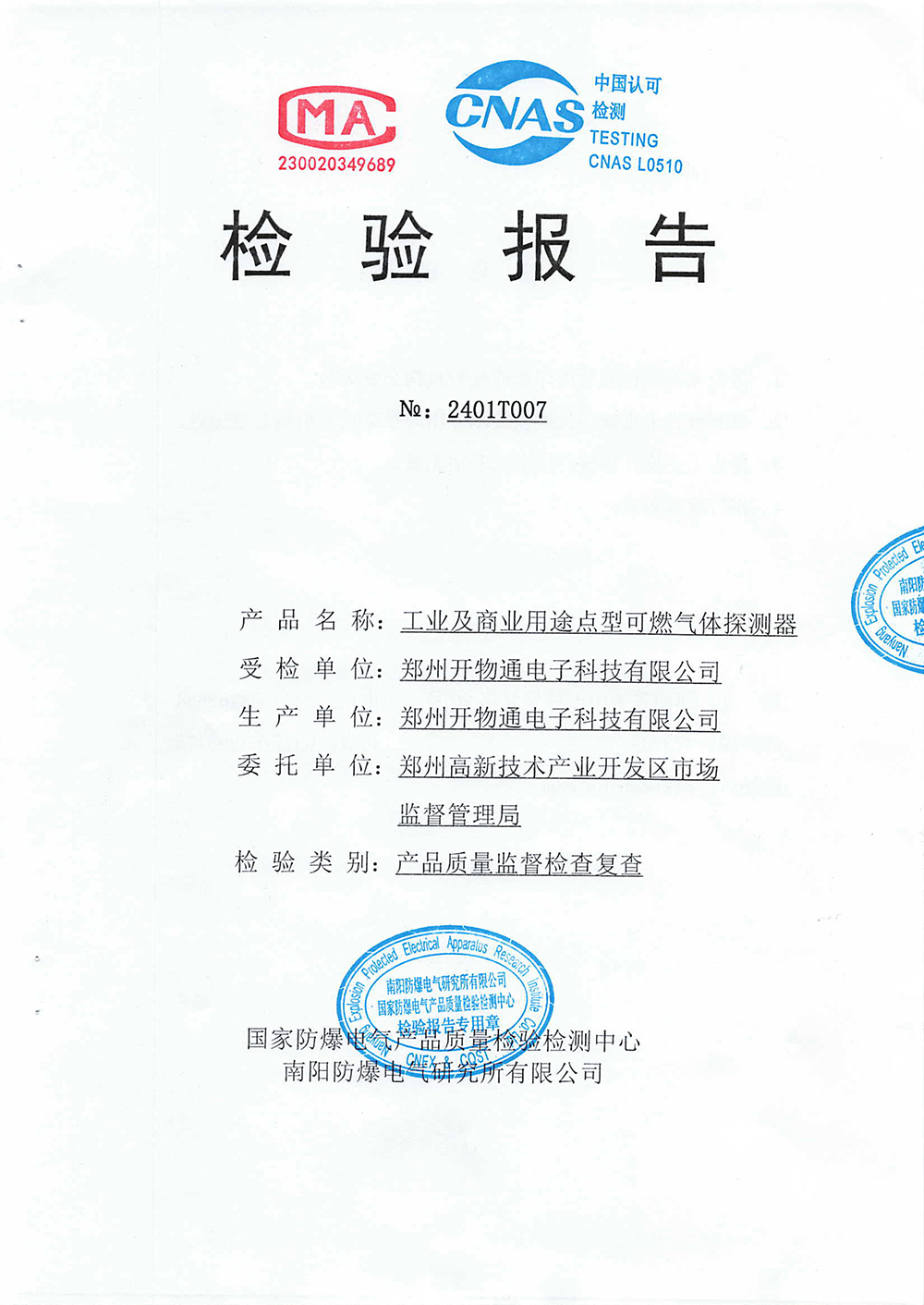近日,在由鄭州市市場(chǎng)監(jiān)督管理局組織的,由國(guó)家防爆電氣產(chǎn)品質(zhì)量檢驗(yàn)檢測(cè)中心(南陽(yáng)防爆電氣研究所有限公司)承擔(dān)的監(jiān)督抽查中,經(jīng)過(guò)嚴(yán)格的質(zhì)量檢驗(yàn)和評(píng)估,鄭州開(kāi)物通電子科技有限公司自主研發(fā)、設(shè)計(jì)、生產(chǎn)、制造的工業(yè)及商業(yè)用途點(diǎn)型可燃?xì)怏w探測(cè)器成功通過(guò)了本次質(zhì)量監(jiān)督檢查,再次證明了開(kāi)物通產(chǎn)品的高質(zhì)量和穩(wěn)定性能!